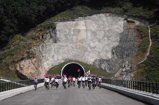 Hoy día 26 de julio es el 2ª día de la marcha desobediente en bicicleta. Por la mañana los ciclistas opositores al TAV han salido de Legutio en dirección hacia Aramaio. Antes de llegar a Aramaio han subido al barrio de Azkoaga donde han tomado una pista que les conducía directamente a la plataforma del TAV. Una vez alli, en medio de un viaducto de 1400 metros de largo y 70 metros de alto, se han desplegado dos pancartas en las cuales se podia leer TAV-AHT STOP y EL BIDEGORRI (carril bici) MÁS CARO DEL MUNDO. Luego, utilizando como carril bici la plataforma del TAV que en este tramo ya está acabada, los ciclistas han cruzado 3 túneles atravesando Udalaitz y llegando al barrio de Iguria de Elorrio. Los opositores al TAV han podido comprobar cómo de hecho ya se está dando un uso alternativo a la infraestructura del TAV y que nadie había anunciado antes: refugio de cabras, almacén de fardos de paja, leña y aperos de labranza. Hemos de reconocer que aunque siempre hemos dicho que el TAV es una infraestructura inútil, comprobamos cómo algún uso ya se le está dando a la misma...