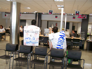 Donostia. Esta mañana una docena de personas de mugitu! Se han plantado en el Hospital Provincial de Gipuzkoa para denunciar que por un lado se recortan los gastos sanitarios para la población y por otra cada vez son mas los miles de millones de euros destinados a destructivas infraestructuras como el Tren de Alta Velocidad.